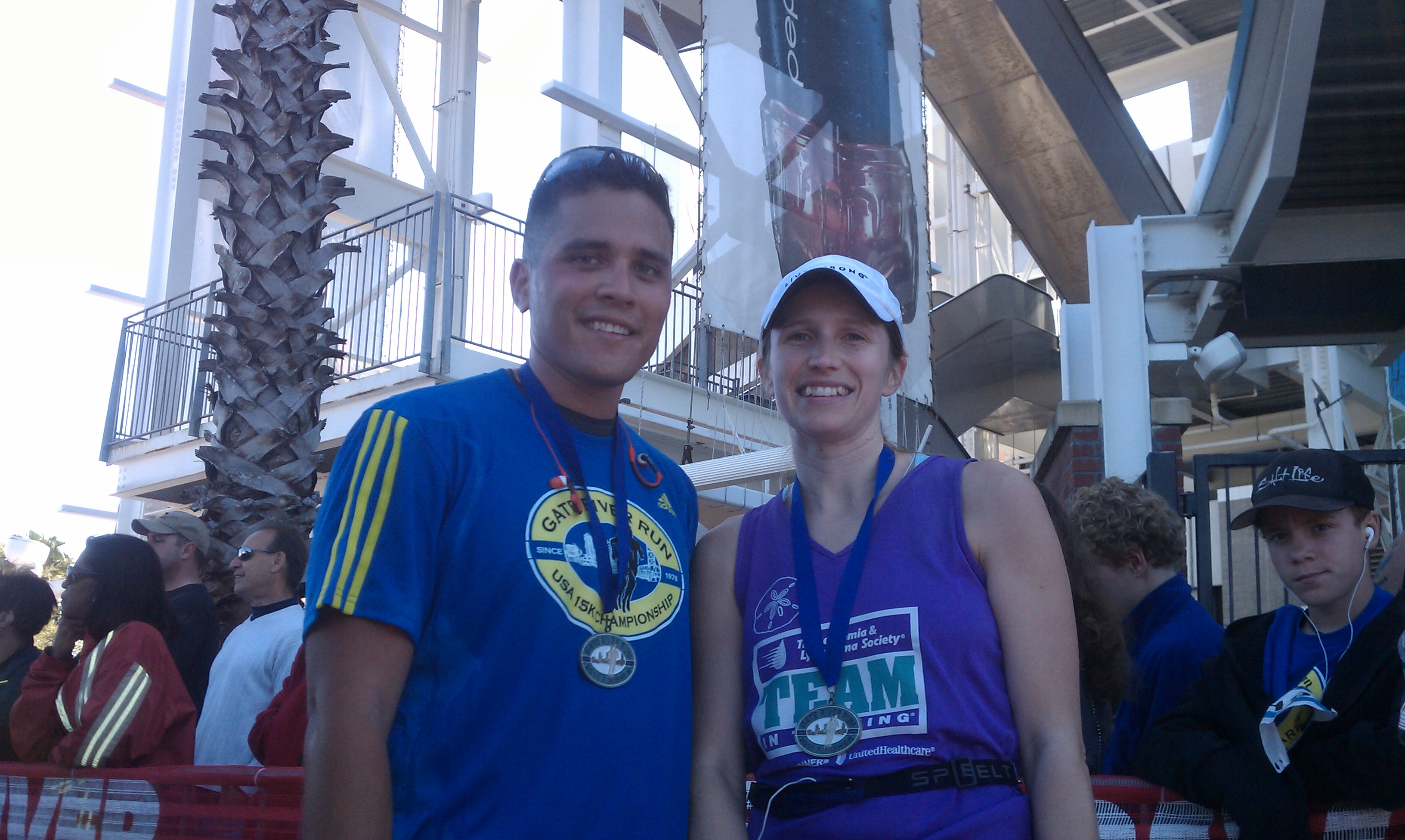 Needless to say, that man and I got married just a few short months later.  We are coming up on 10 years of marriage.  I guess you can say that this was a pretty important relationship that I gained through running.  He was always a better, faster runner than me… up until 2 years ago.  I really took the challenge and ran with it.  I spent countless hours planning and training… to beat him, of course.  And I did just that during the Jacksonville Gate River Run 15K.  During the last 1/2 mile I passed him.  Then, a few months later, I passed him during the second half of the 10-mile Pumpkin Run.  Yeah baby!  Sure, it might never happen a third time, but I won’t admit that it didn’t feel good, especially when I think back to the running days when we first met.  I have come a long ways since then!